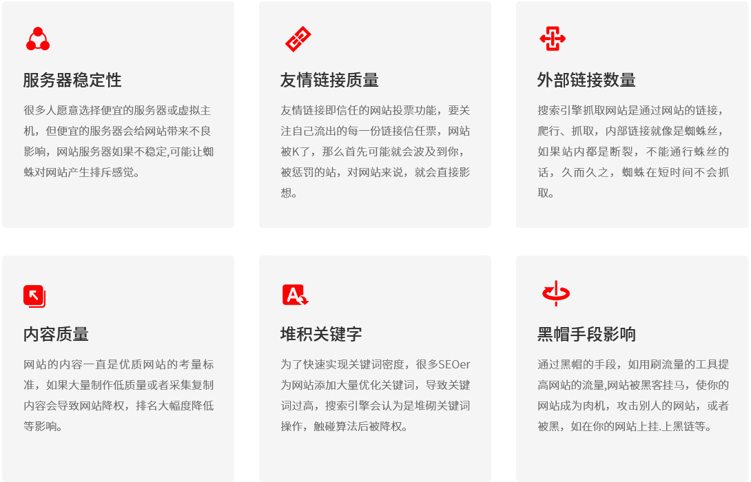 如果您怀疑网站受到处罚,您必须尽快采取行动,找出问题恢复网站排名;降权是指搜索引擎对网站评定的级别下降,是搜索引擎对网站进行的一种处罚方式。通常多为网站自身作弊(黑帽SEO)导致的,通过“降权恢复服务”找出问题并改正错误一段时间后会自行恢复。